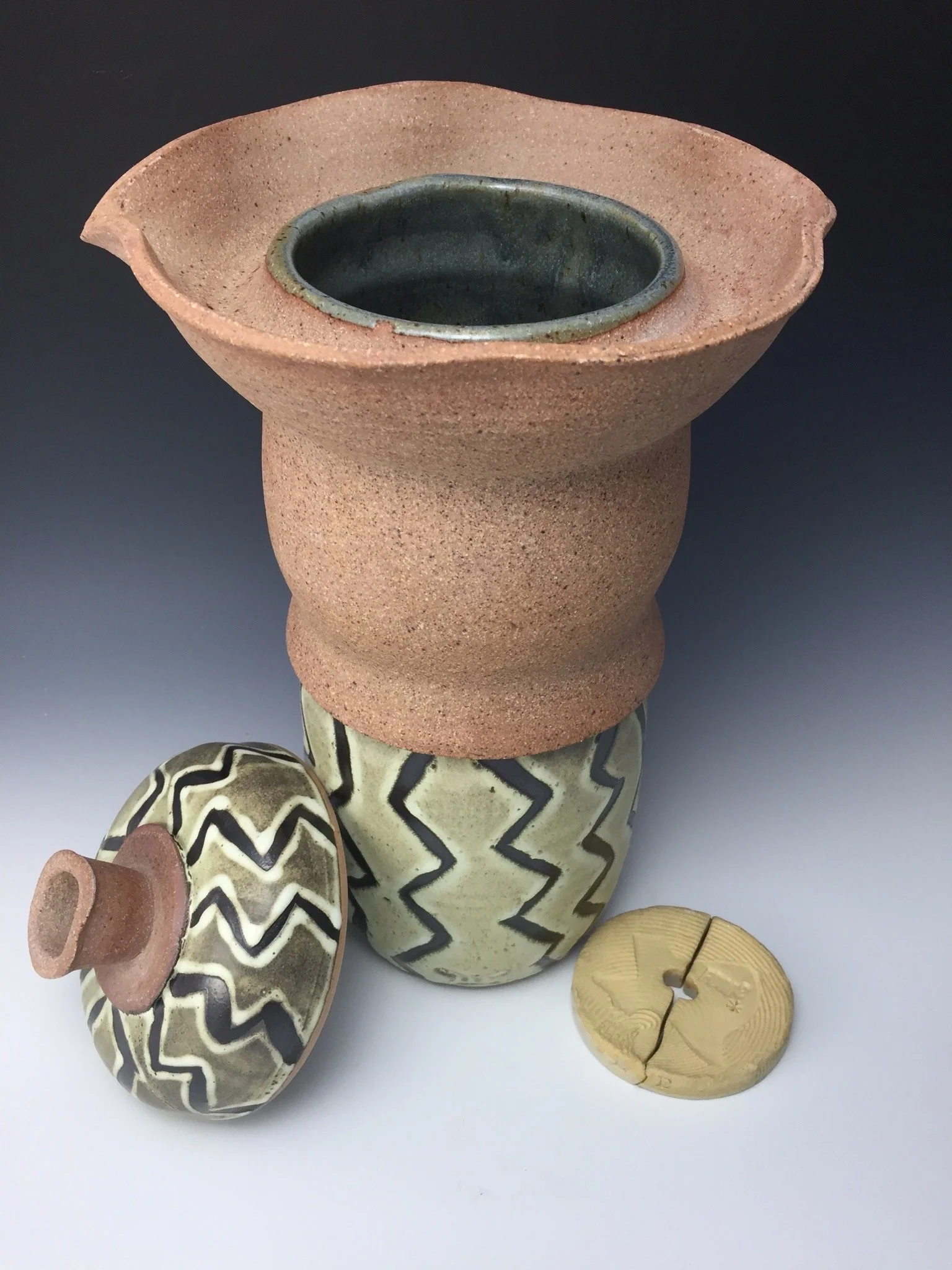 22” Stoneware, wheel thrown Wall platter stoneware with Shino and overlay glazes, unglazed rim. Cone 6 reduction fired, 22”w x 3”h.